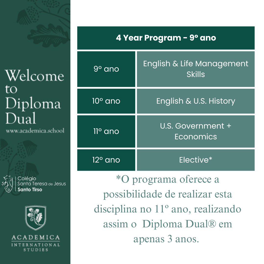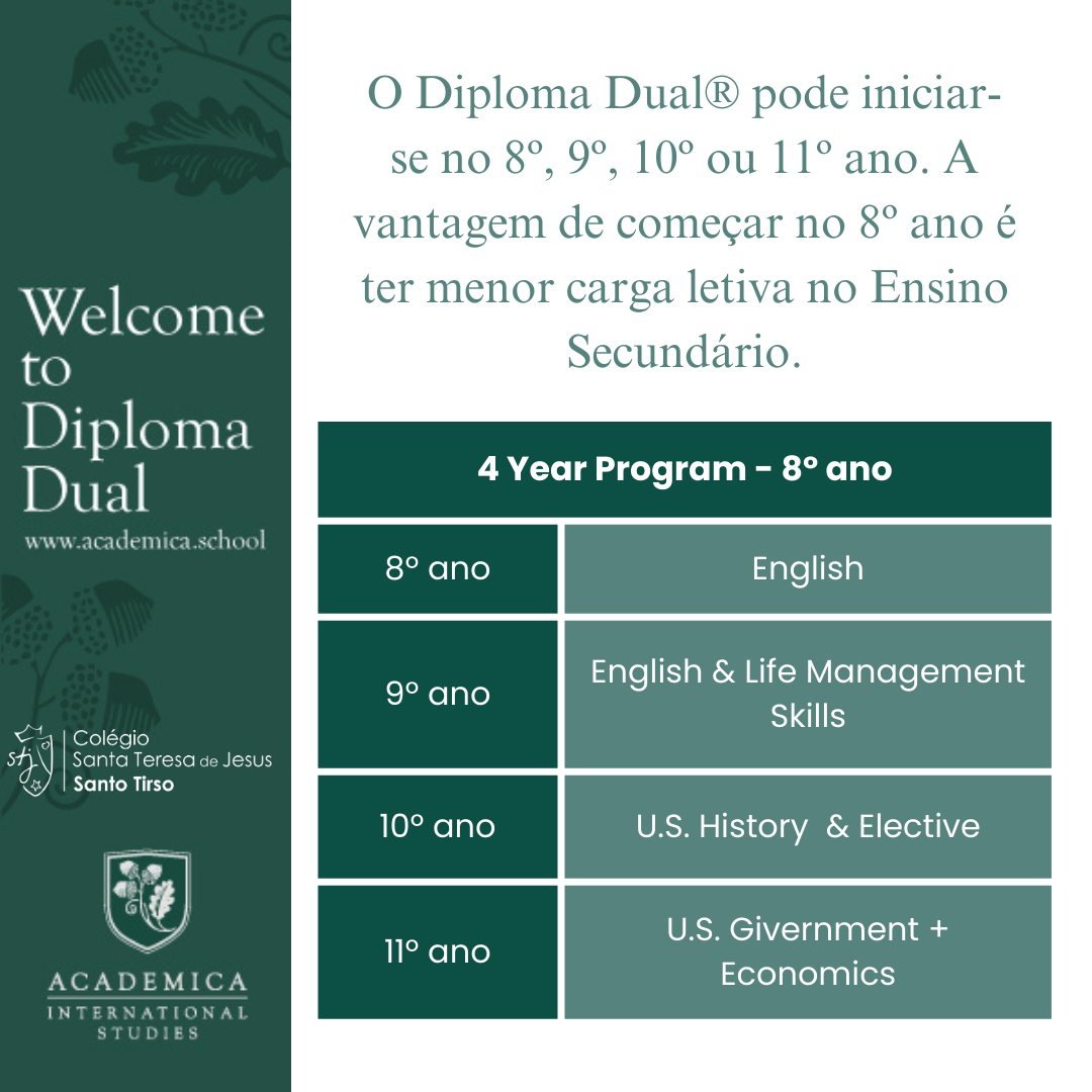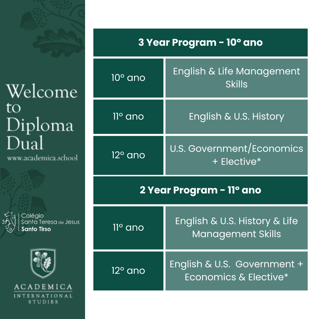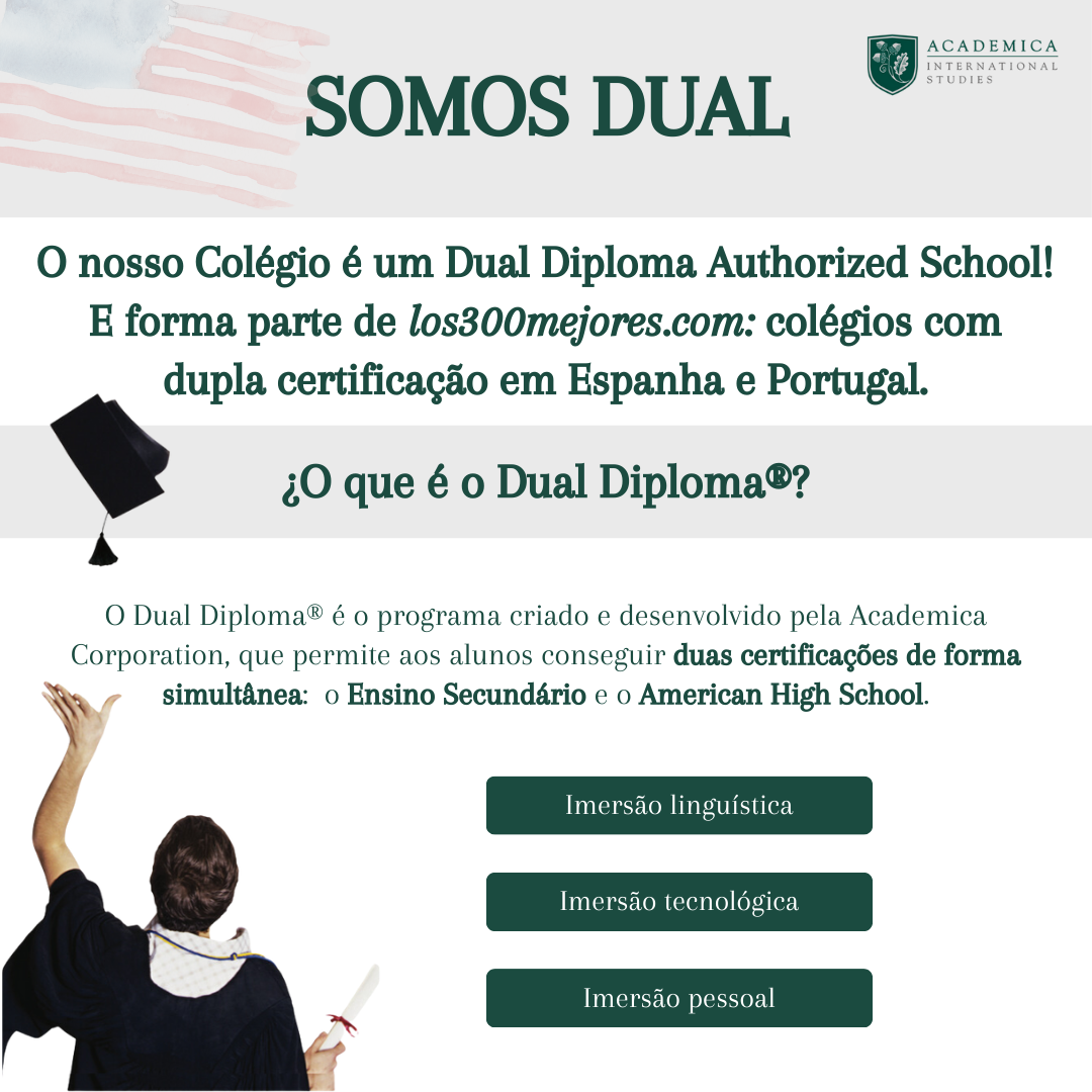 O Colégio associou-se à Academica Corporation, para proporcionar aos alunos a frequência do programa Diploma Dual®, um programa oficial de equivalência internacional de diplomas de Ensino Secundário que permite aos alunos obter dois diplomas em simultâneo: a do seu país e o American High School Diploma. Quando finalizam os seus estudos, os alunos do Diploma Dual® alcançam exatamente a mesma certificação que os alunos norte-Americanos ao finalizar o High School, que será reconhecida em todos os Estados e em toda as Universidades do mundo.